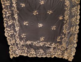 Antique mantilla in French Caen lace, hand embroidered in 20th century.
