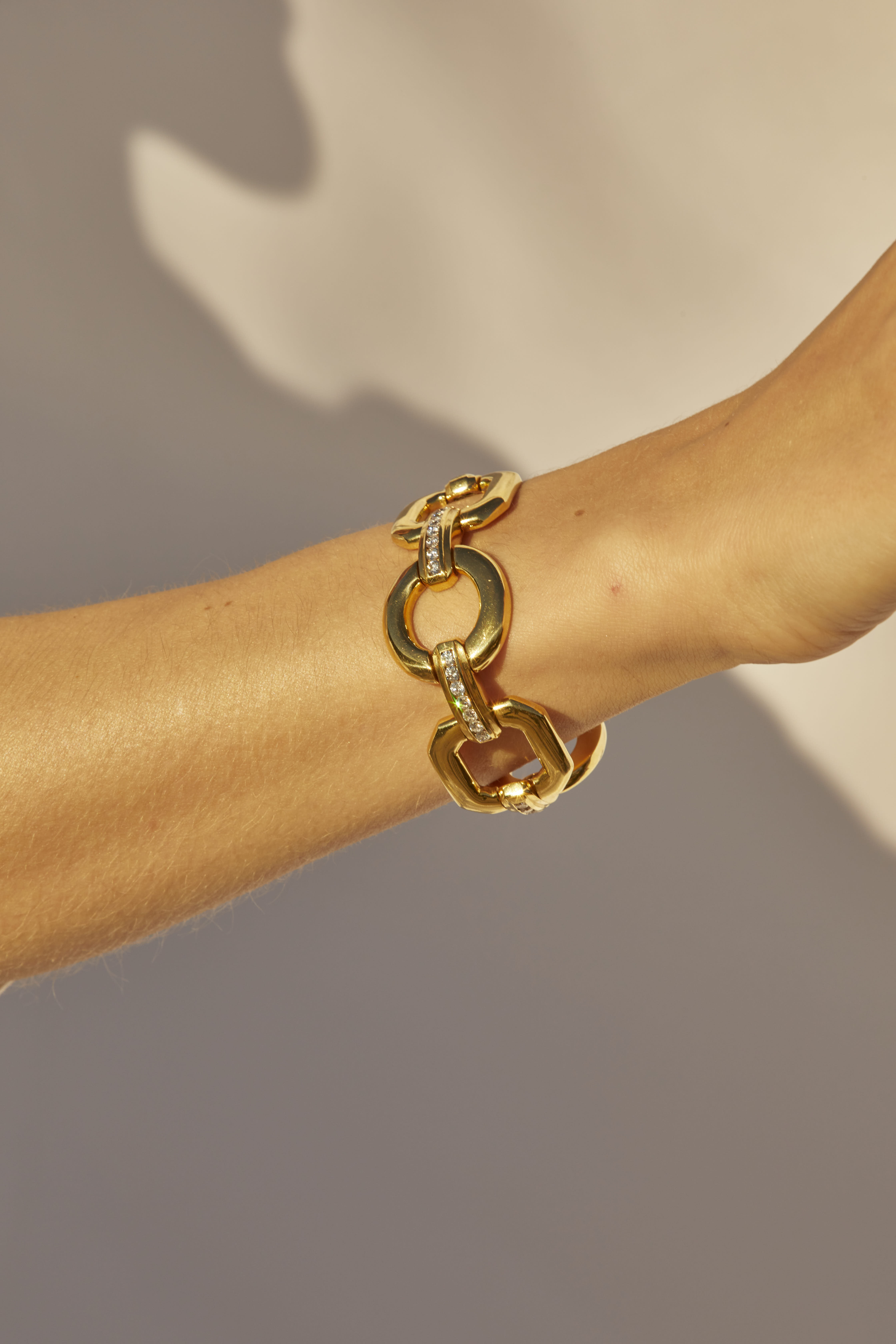 Pulsera de oro geométrica de eslabones en oro amarillo de 18 kt. y diamantes talla brillante.