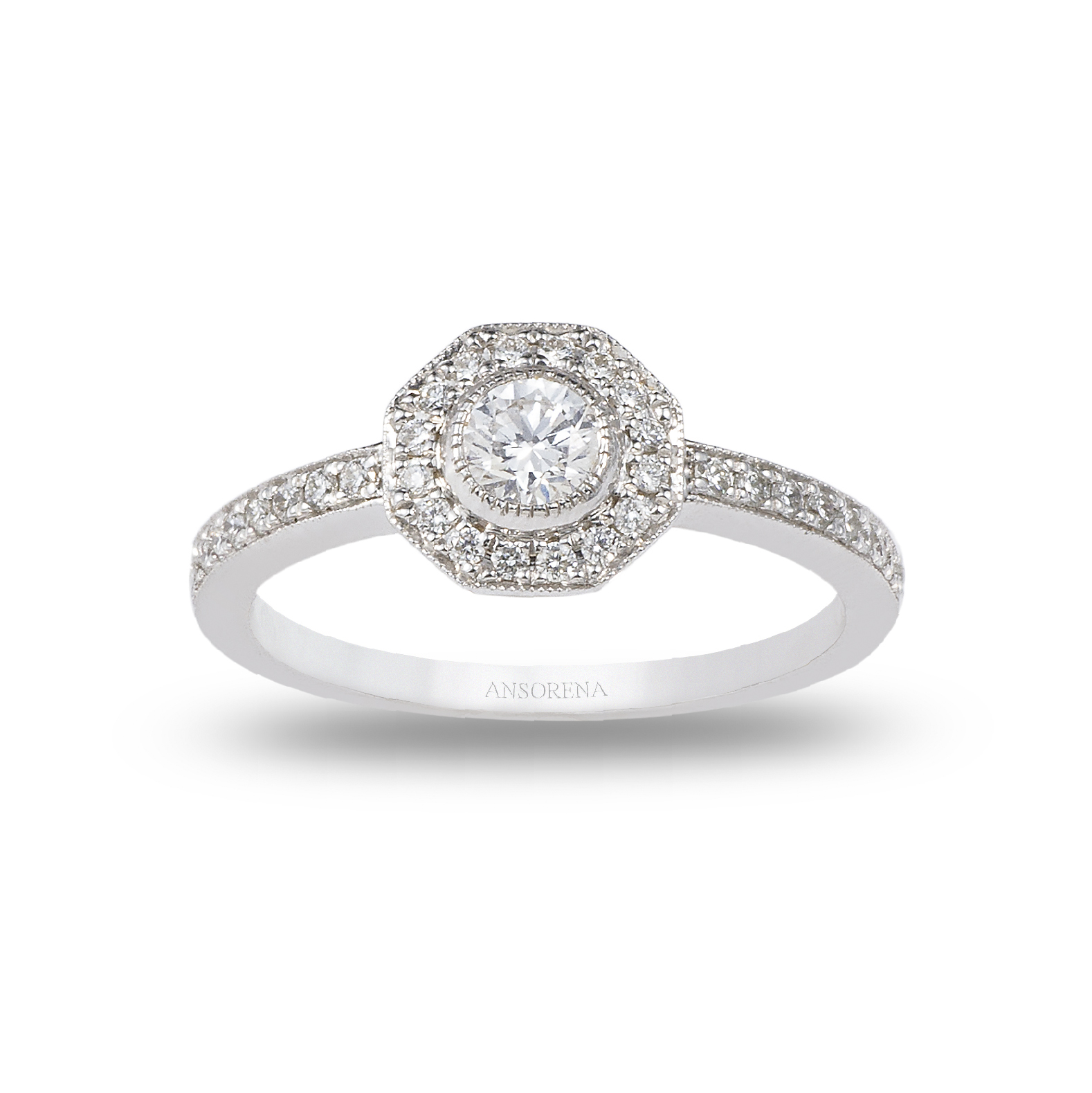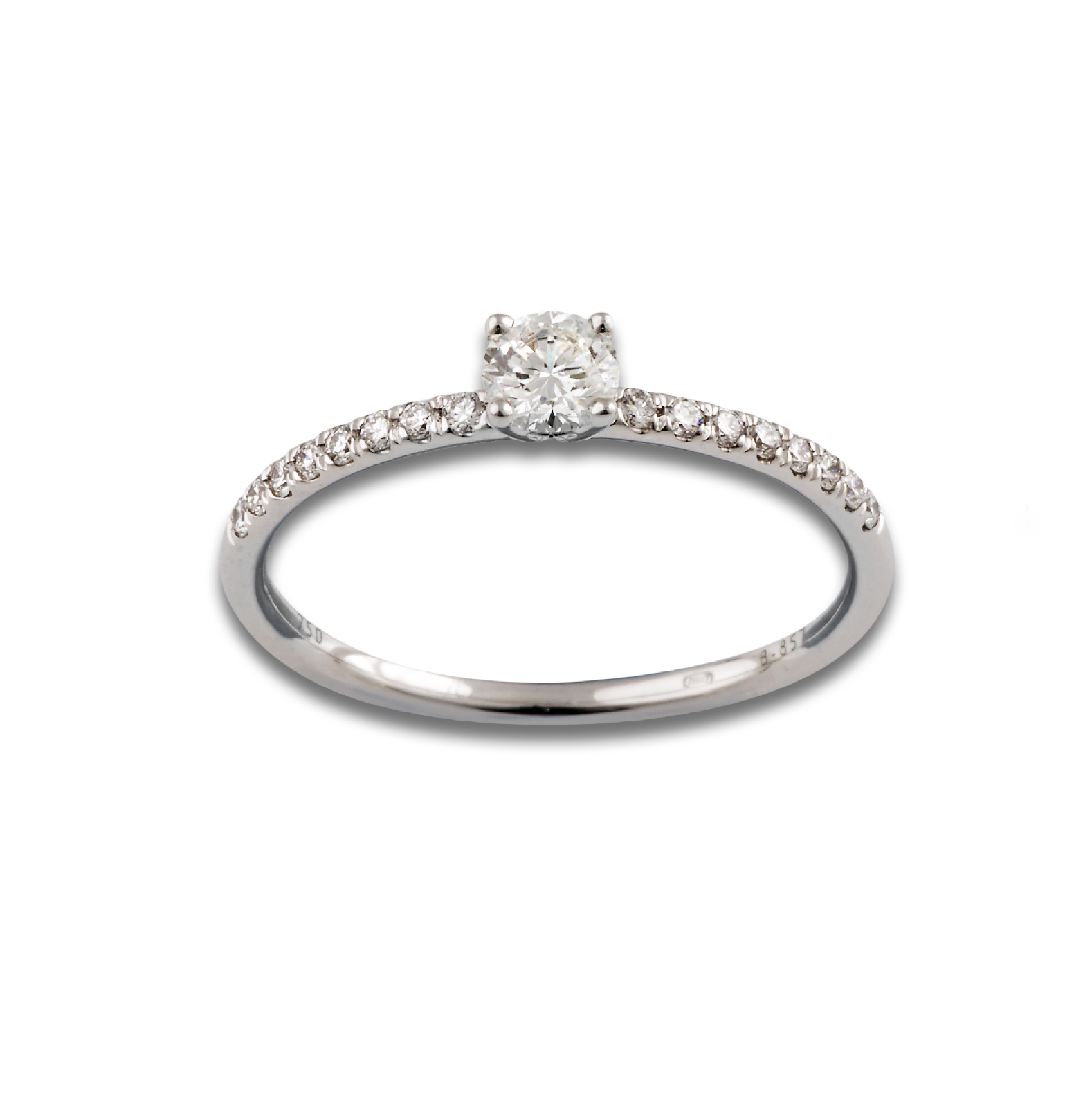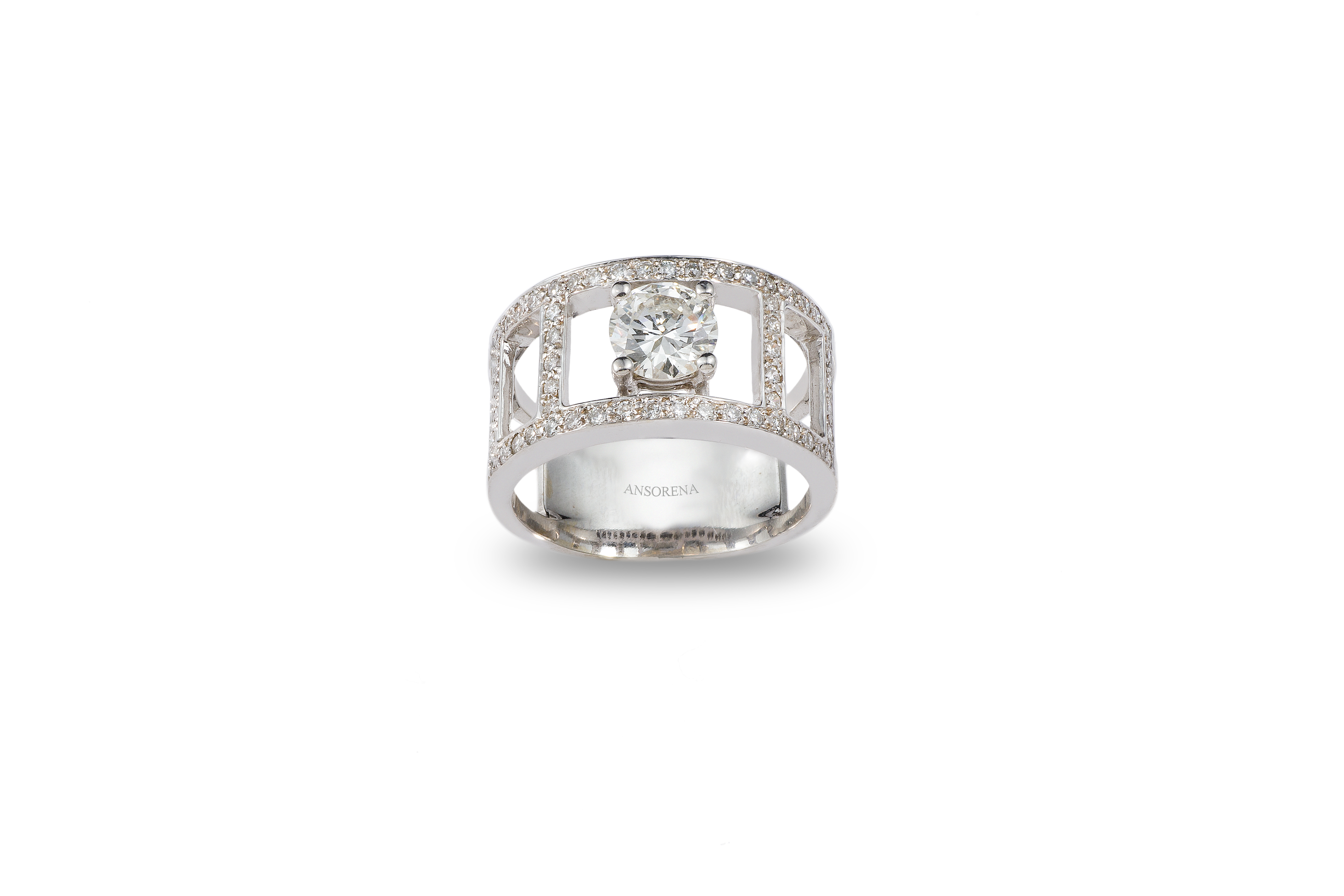 Solitario de oro blanco de 18 kt. con diamantes dispuestos en cenefa geométrica calada con peso total de 0.43 ct. y diamante central talla brillante de 0.80 ct., color G, pureza VSI.
