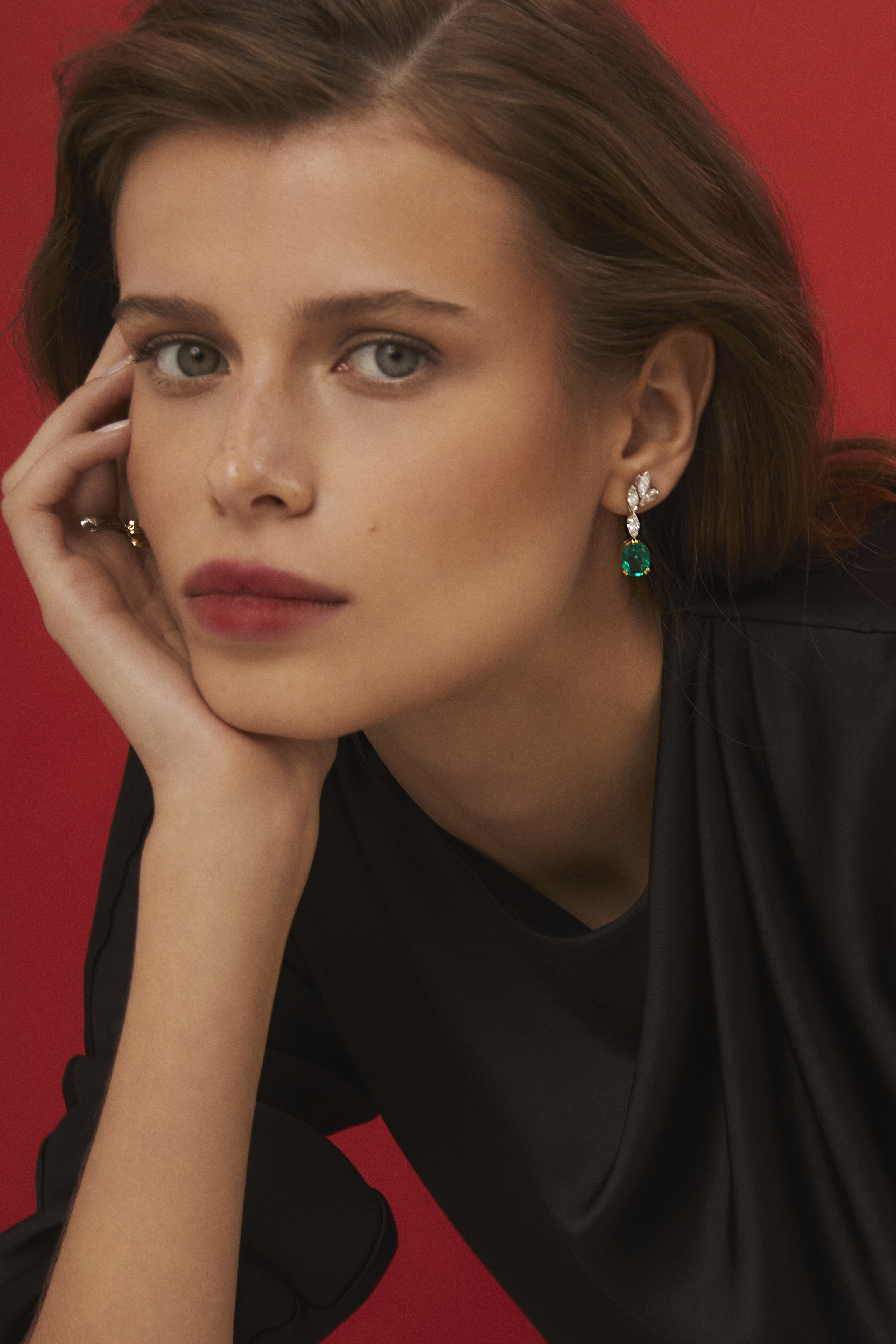 Pendientes largos de oro amarillo y blanco de 18 kt. formados por diamantes talla marquise de los que penden dos esmeraldas en su talla.