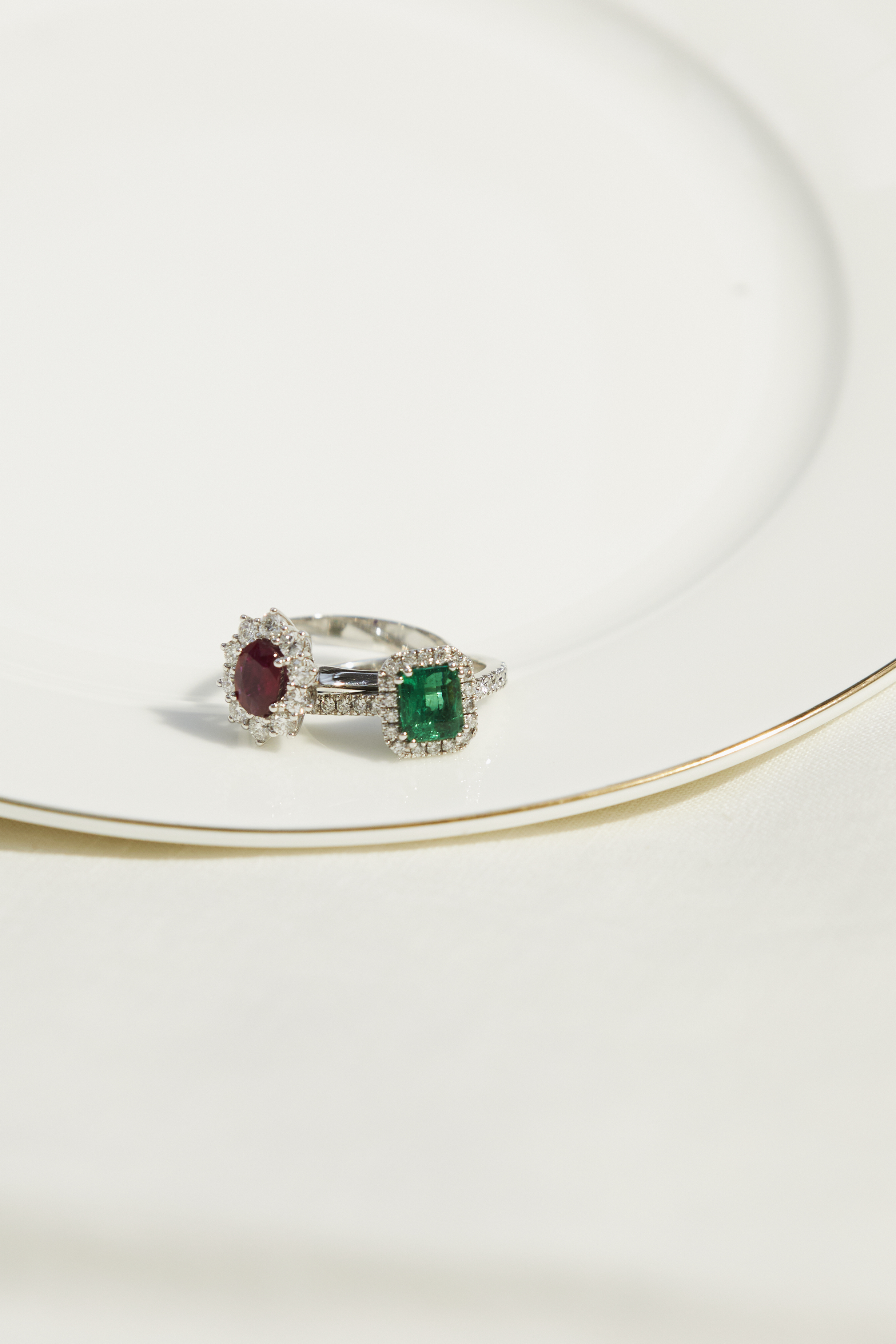 Solitario de oro blanco de 18 kt. con esmeralda central de 1.27 ct. orlada por diamantes talla brillante y pavé en los brazos, peso total 0.36 ct. calidad F SI