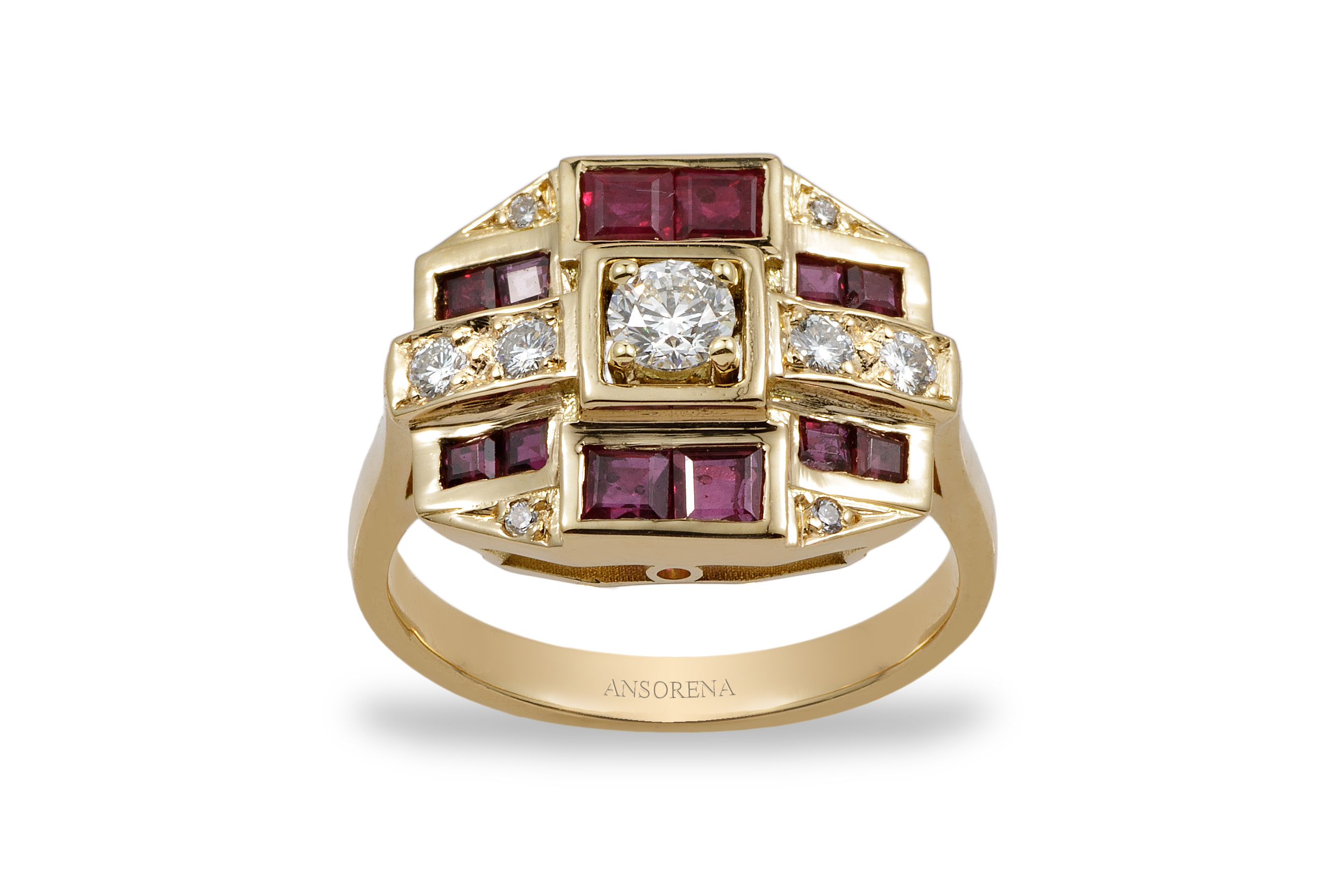 Anillo Casilda Se Casa mini de oro amarillo de 18 kt. con diamante central talla brillante de 0.20 ct. con bandas de rubíes talla princesa, peso total 1,20 ct. y diamantes talla brillante, peso total de 0.16 ct.