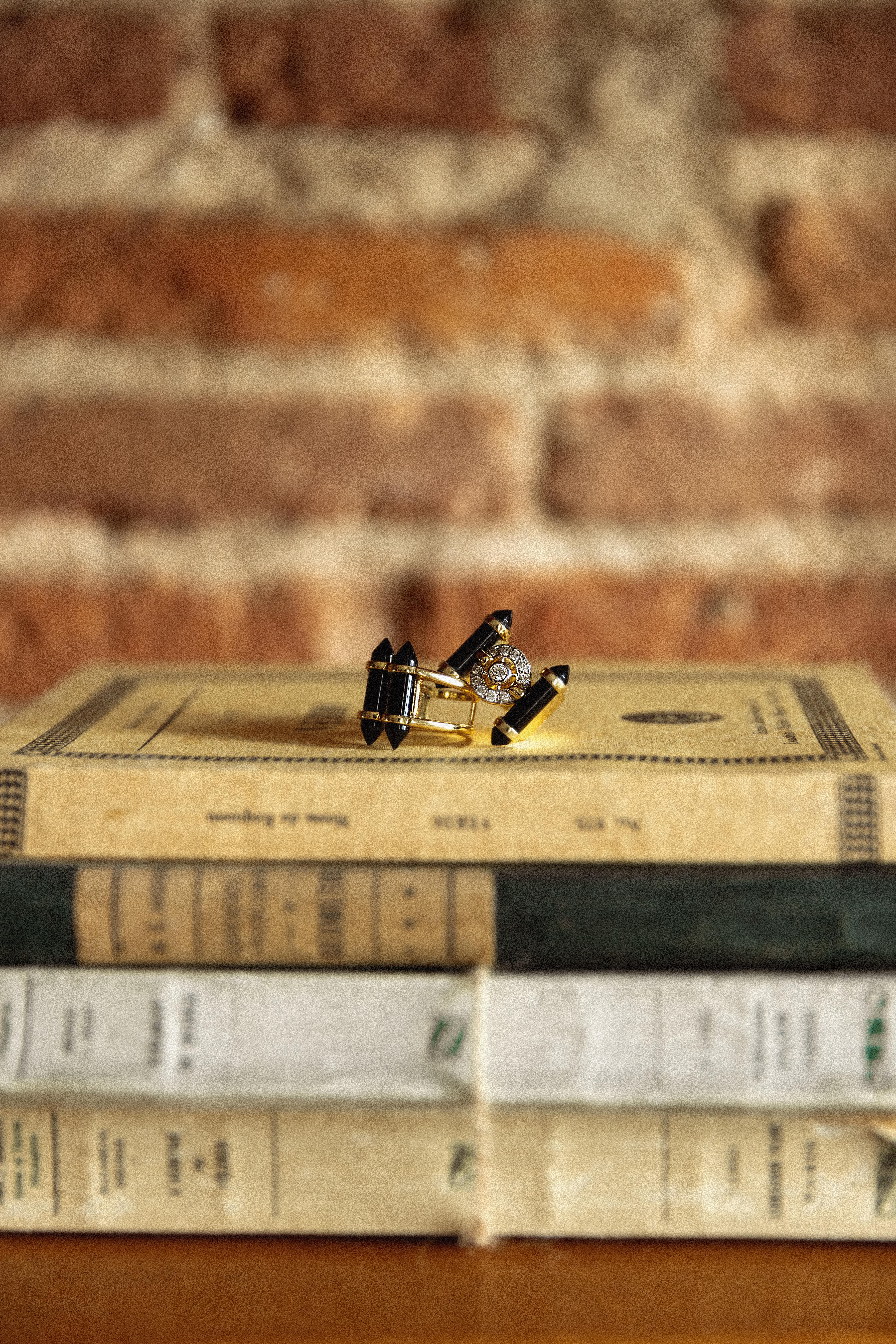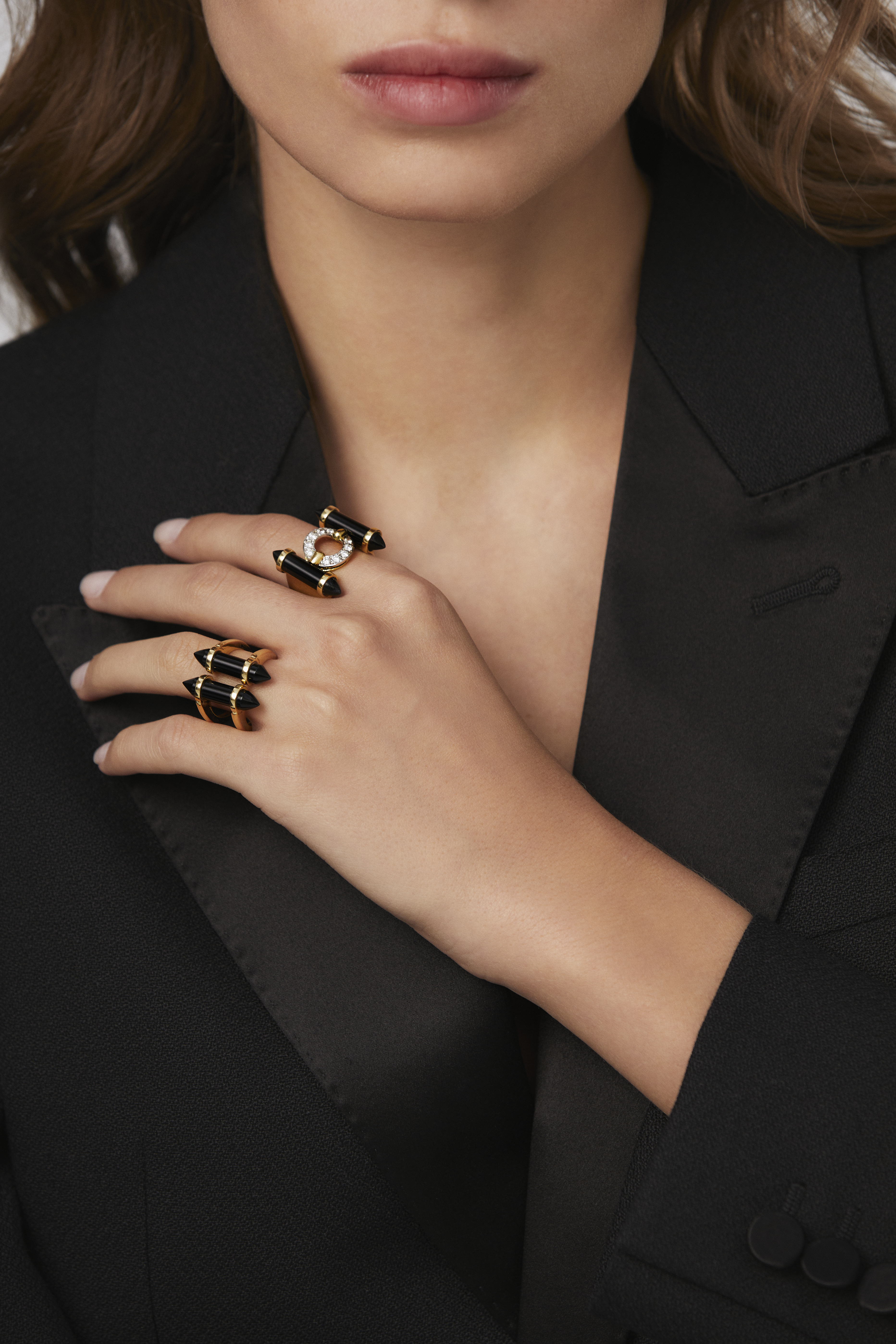 Solitario Colección Ars de oro amarillo 18 kt. formada por un diamante central, peso 0.22 ct. engastado en chatón y orlado por diamantes talla brillante, peso total 0.37 ct., flanqueada por dos cilindros de ónix
