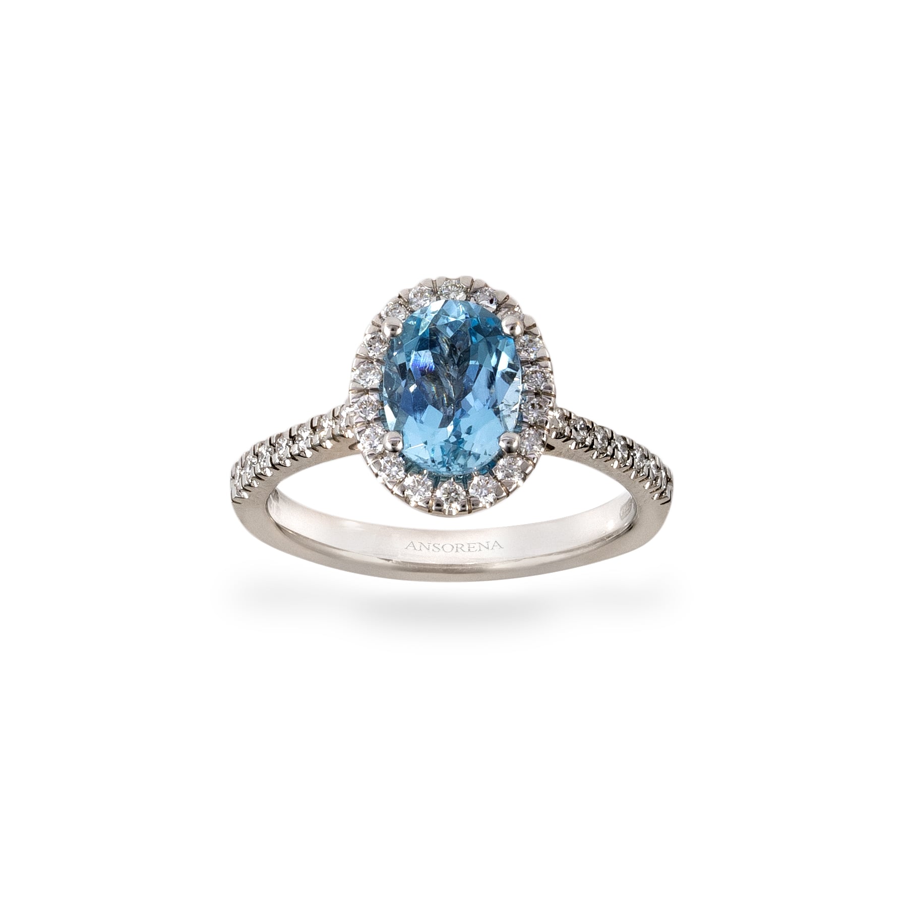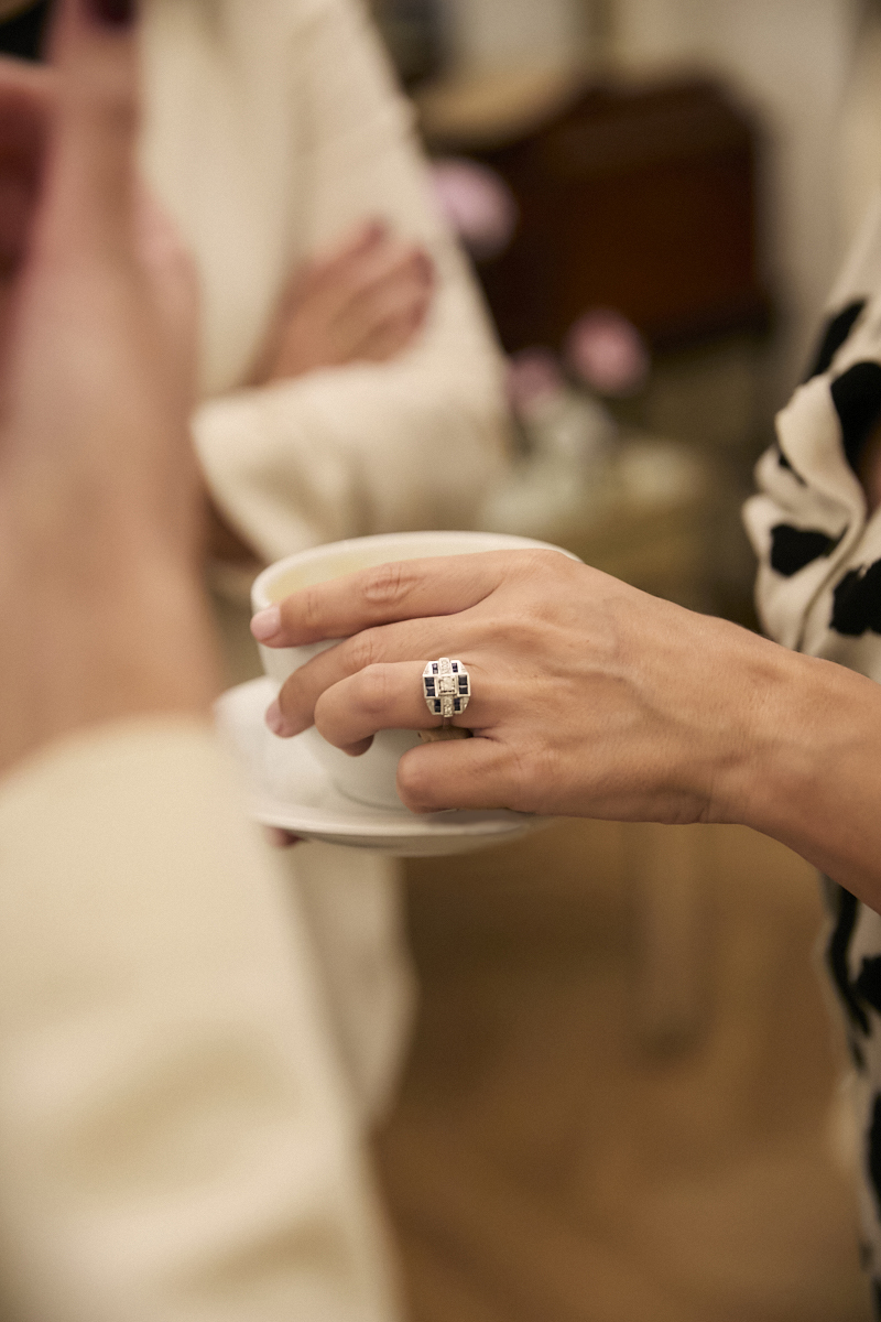 Anillo Casilda Se Casa mini de oro blanco de 18 kt. con diamante central talla brillante de 0.20 ct. con bandas de zafiros talla princesa, peso total 1,17 ct. y diamantes talla brillante, peso total de 0.16 ct.