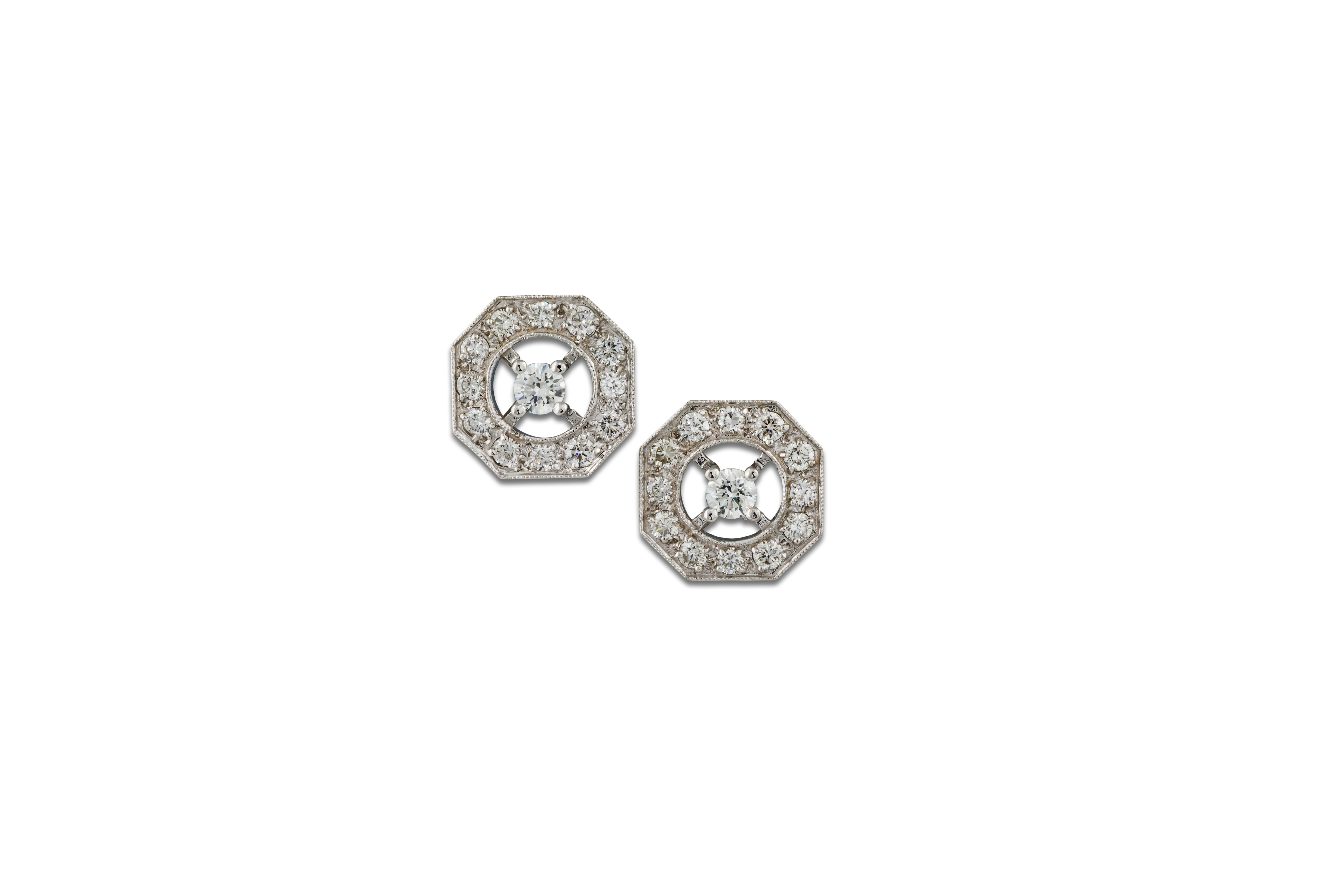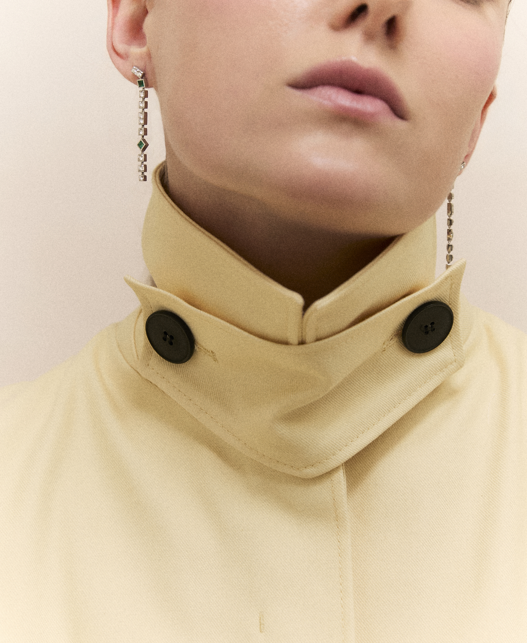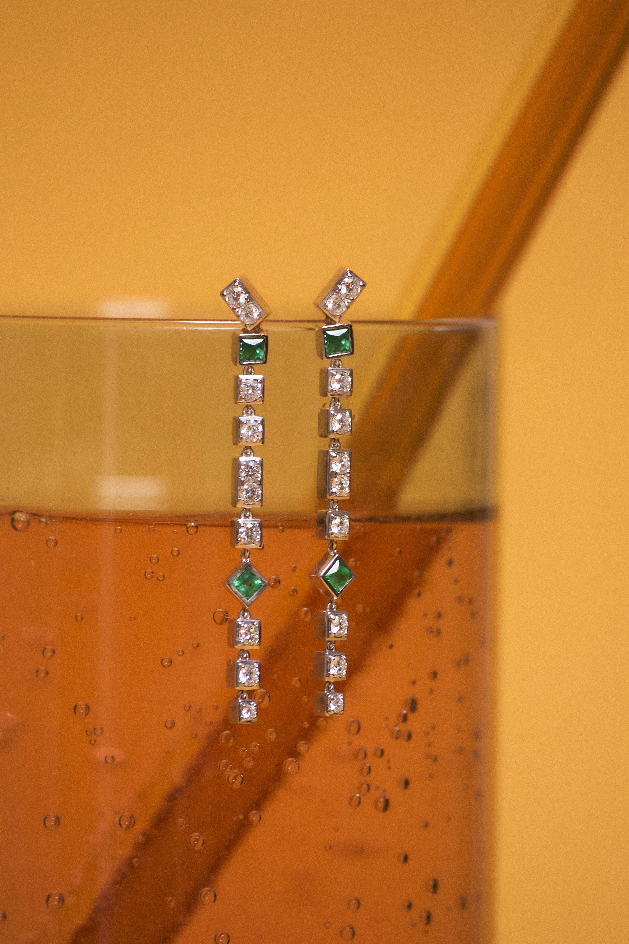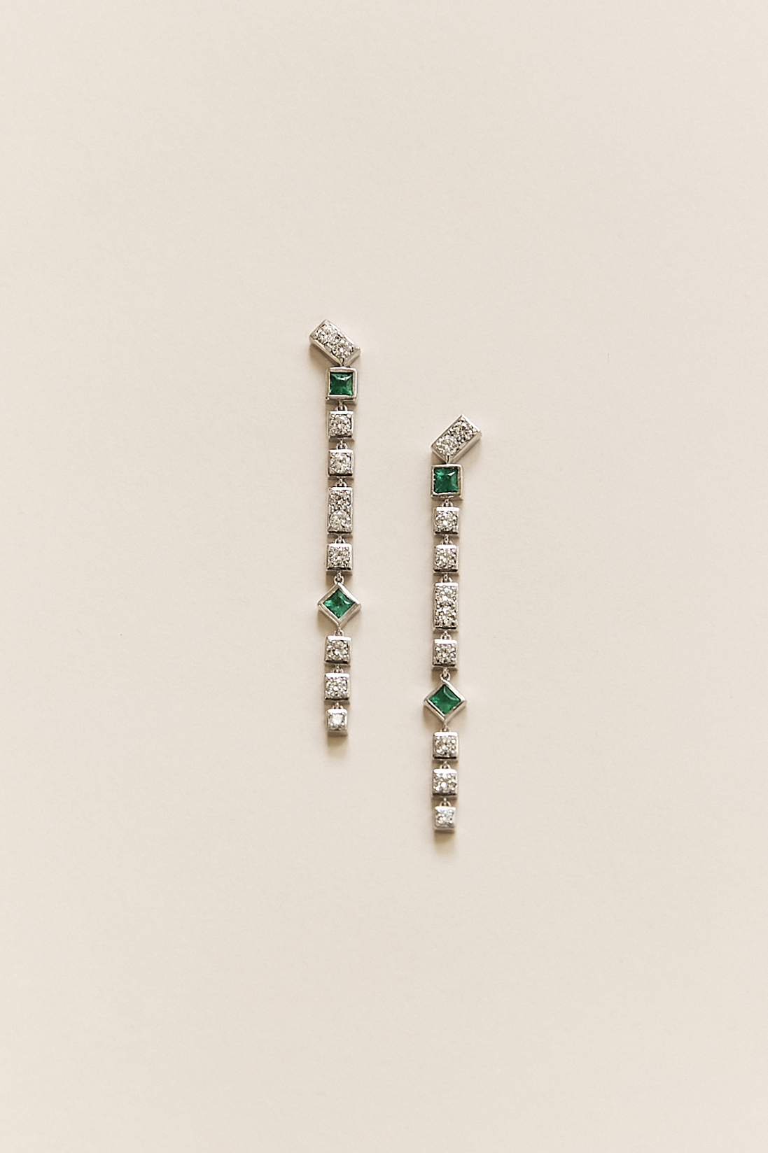 Pendientes Casilda se Casa en oro blanco 18kt. con diamantes talla brillante, peso total 1ct. con esmeraldas intercaladas talla princesa, peso total 0.40ct.