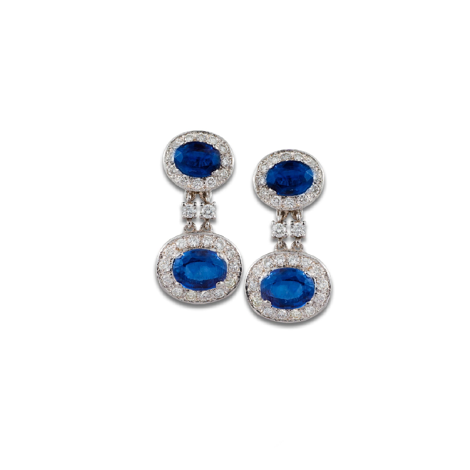 Pendientes de oro blanco de 18 kt. con dos diamantes talla brillante, peso total 0.42 ct., del que penden dos diamantes talla baguette, peso total 0.20 ct., y aguamarinas talla pera, 2.20 ct.