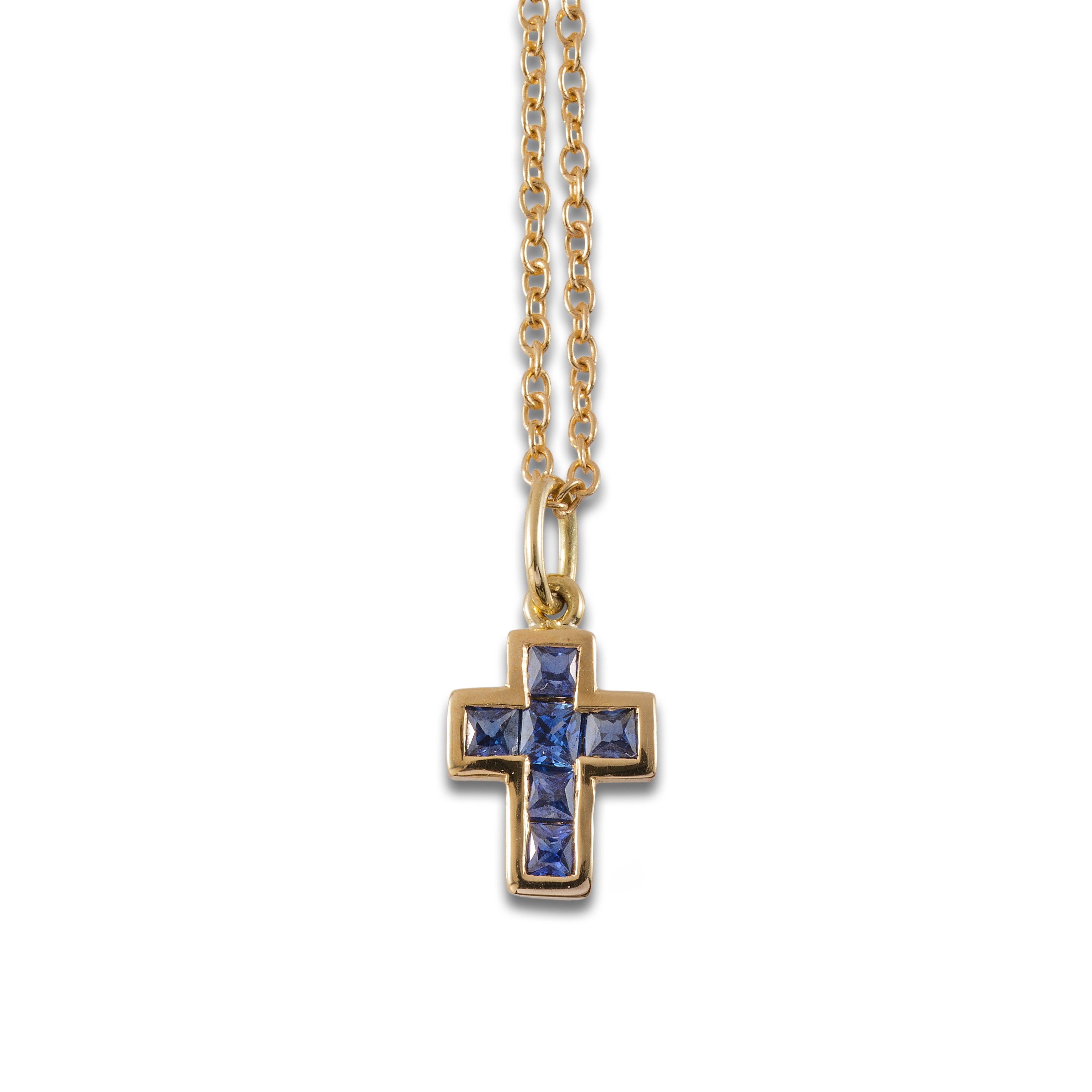 Cruz de oro amarillo de 18 kt. compuesta por rubíes talla carré engastados en carril, peso total 0.40 ct.