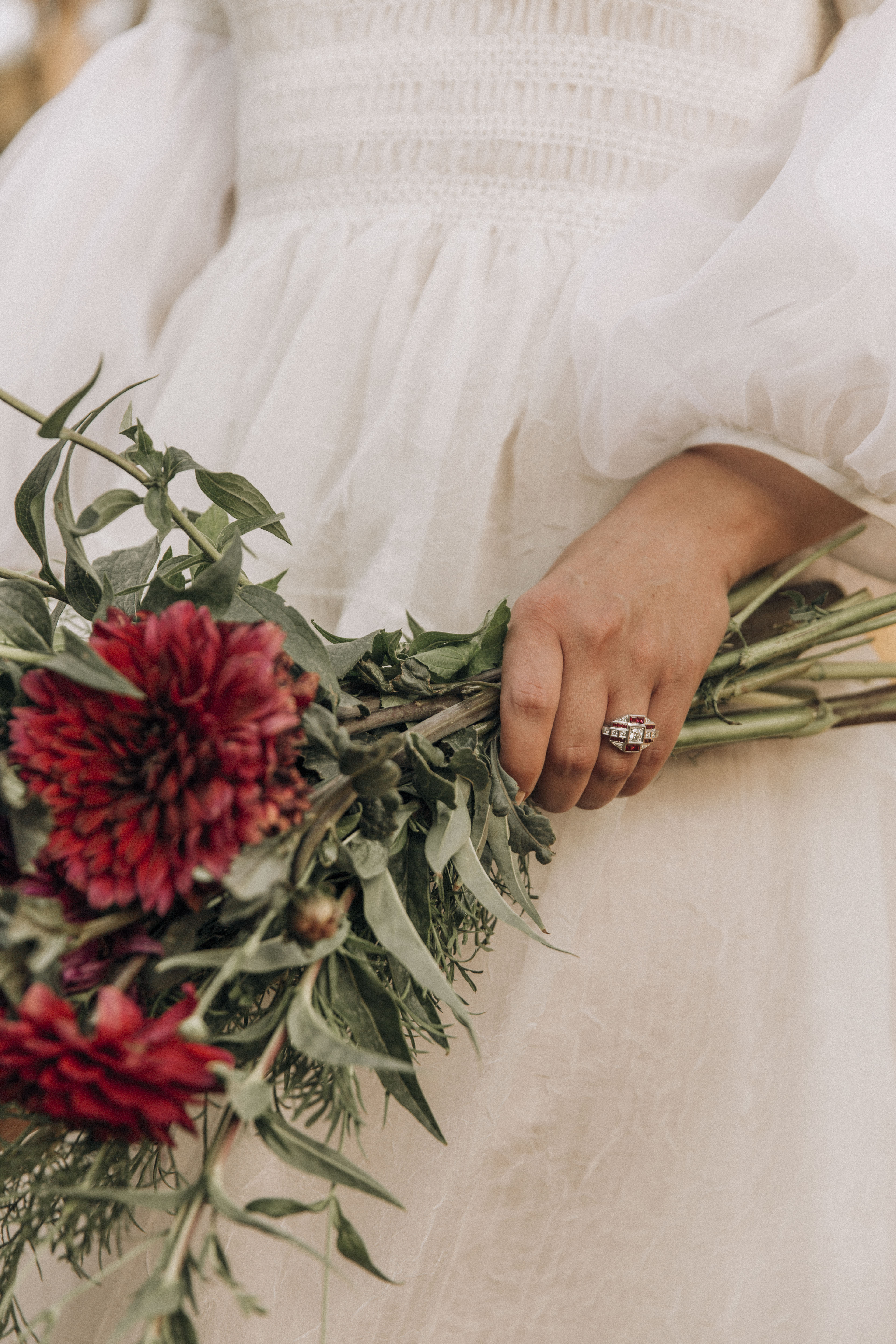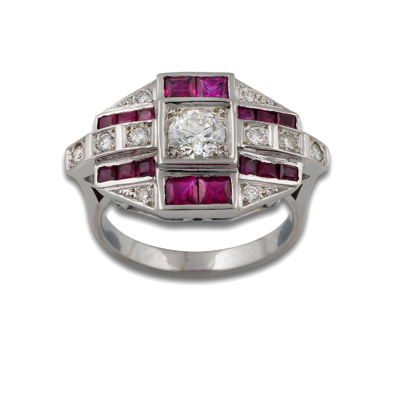 Anillo Casilda Se Casa de oro blanco de 18 kt. formada por un diamante central talla brillante de 0.30 ct., flanqueado por rubíes talla princesa y diamantes talla brillante, peso total 0.40 ct.