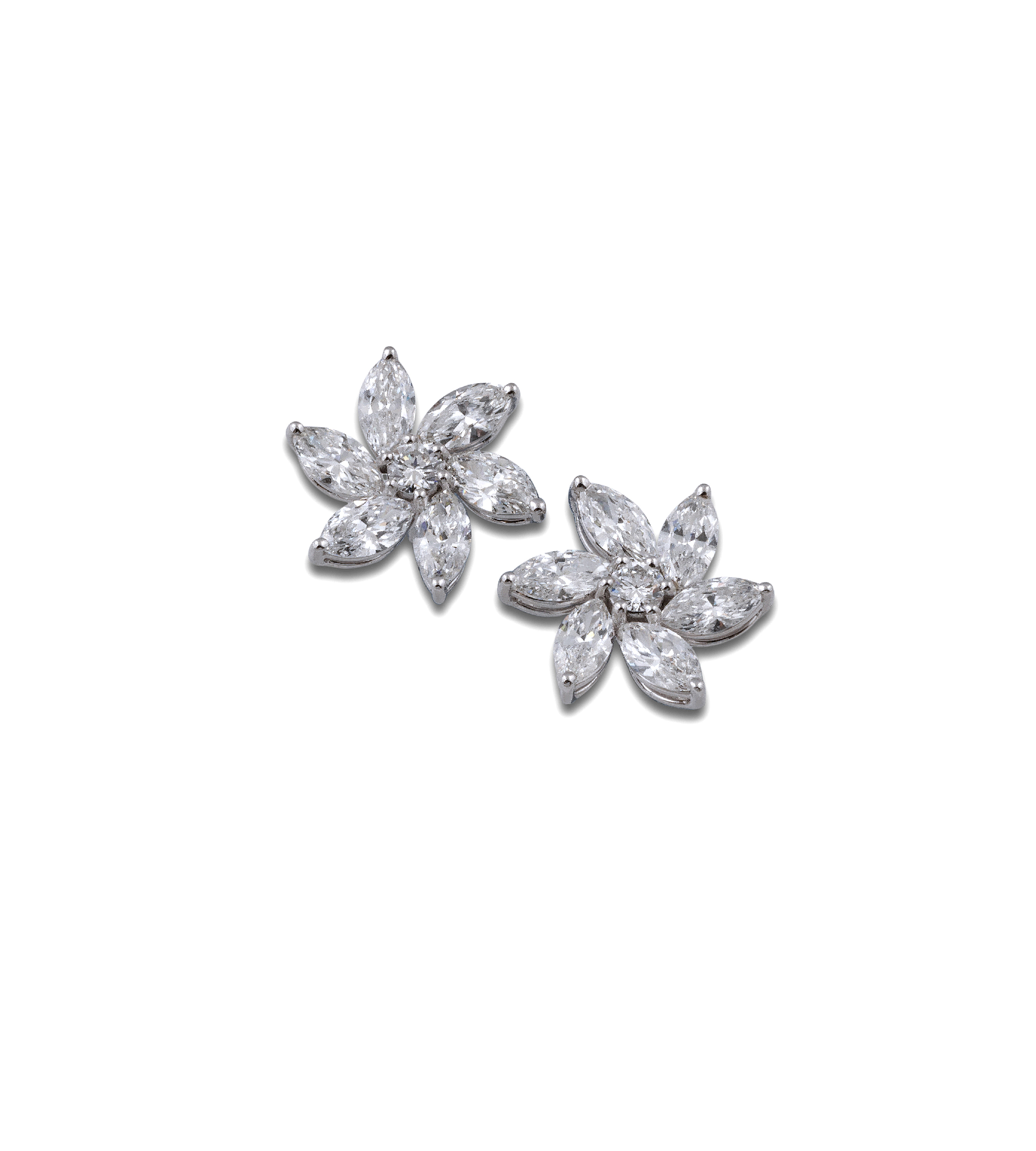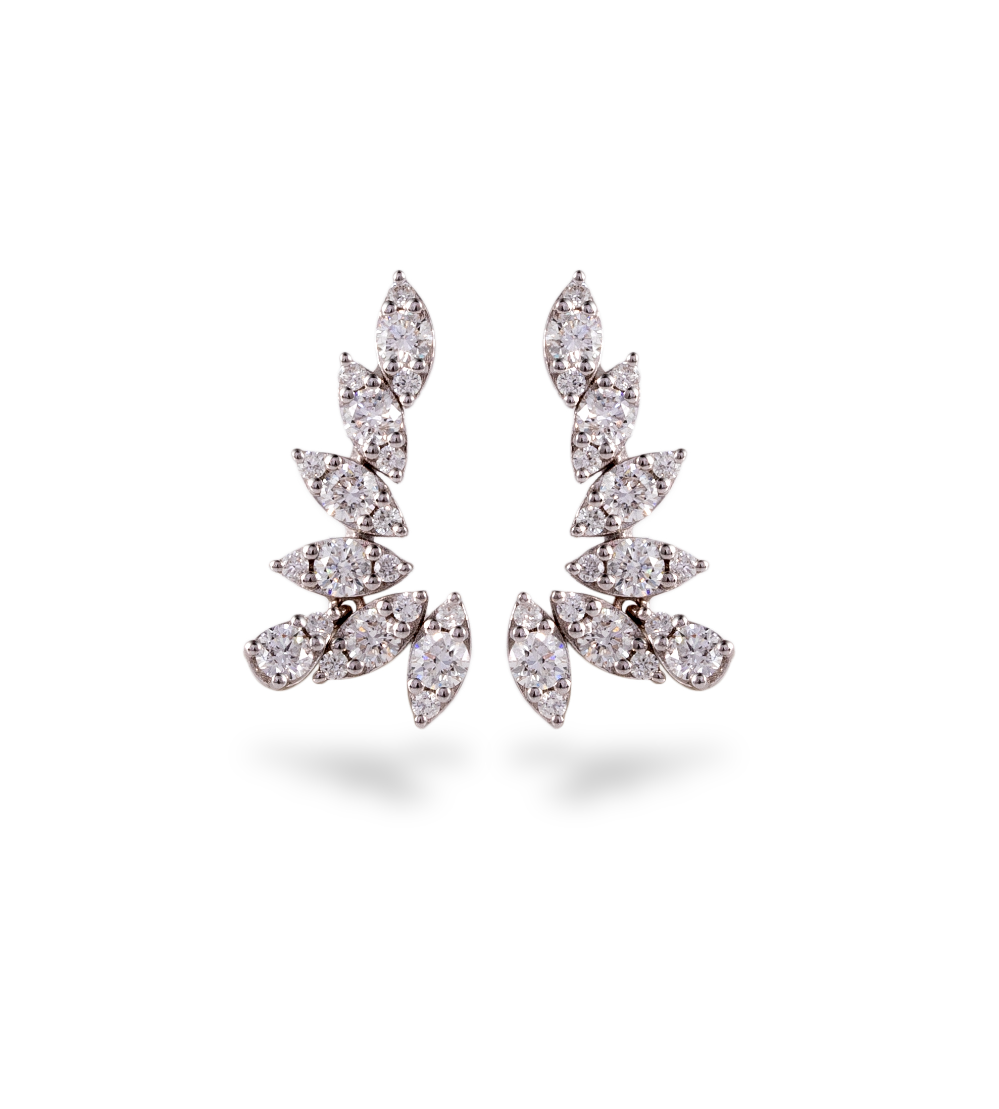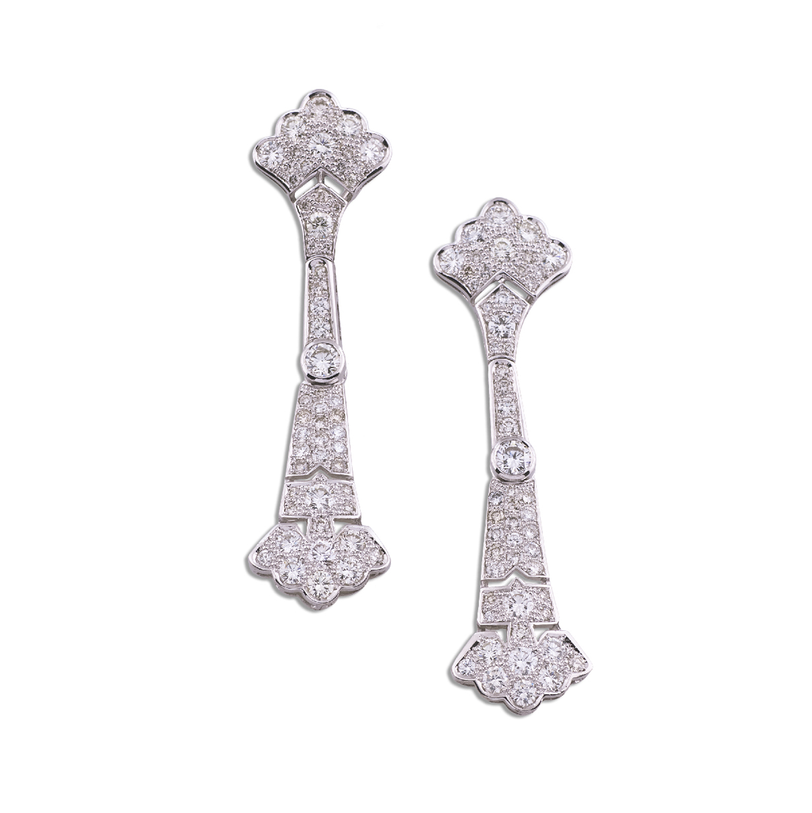 Pendientes largos Art Déco de oro blanco de 18 kt., cuajados de diamantes talla brillante, peso total 5.19 cts.