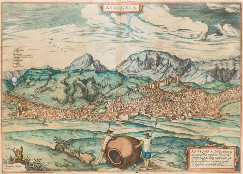 Vista de la ciudad, adosada a la Sierra del Torcal, con su muralla, torres y Alcazaba. Leyenda con 13 lugares notables, gran tinaja y cartela descriptiva.  Reverso en latín.
