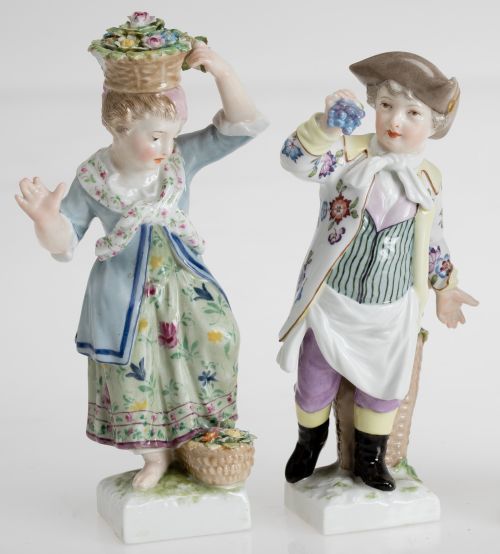 Pareja de figuras de porcelana esmaltada. Presentan faltas. Marcas en las bases.