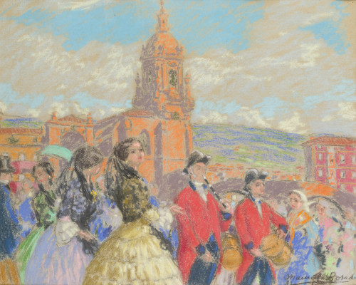 "Desfile en Bilbao con la Iglesia de San Antón al fondo"