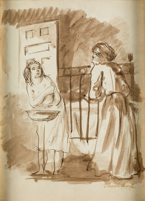 Firmadas en el ángulo inferior derecho. Ambas pintadas en el reverso, con escena cotidiana y calle de Madrid.