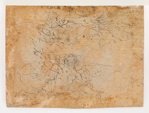 Al dorso escena con ángel realizada a pluma. Estilísticamente ambos dibujos se encuentran muy cercanos a Francisco Rizi (1614- 1685)