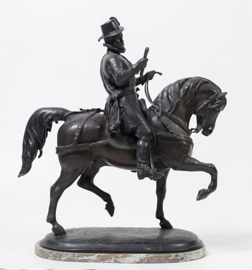 "Felipe II a caballo". Escultura de bronce patinado sobre base de mármol, S. XX. Con inscripción en la base "Hunt".