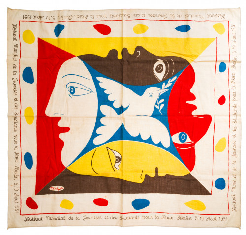 Para el festival de Berlín entre el 5 y el 19 de agosto de 1951. Firmado en plancha de 79 x 74 cm. Reproducido en plena página en la portada del libro «Picasso, 145 dessins pour la presse et les organisations démocratiques», L’humanité 1973, y en G. Gosselin, «Picasso et la Presse»: Un peintre dans l’histoire» p. 107, nº 182.