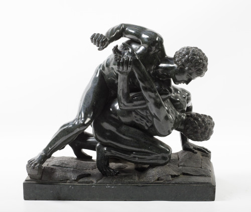 "Luchadores" escultura de mármol verde tallado, ffs. S. XIX-pps. S. XX. Copia de una escultura romana conservada en la Galería de los Uffizi en Florencia y otra similar se encuentra en el Museo Nacional del Prado. Faltas.