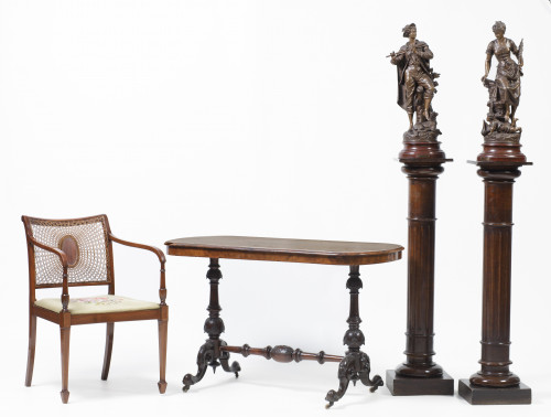 "Paâtre" y "Futur marin", pareja de esculturas de calamina patinada, Francia, pps. S. XX. Con sello "Fabrication française" y chapas tituladas y firmadas "Bruchon" de madera simulando mármol. Sobre peanas de madera simulándo columnas acanaladas.