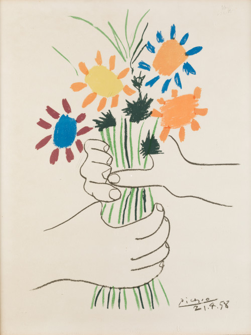 Firmada y fechada en plancha en el ángulo inferior derecho. Reproducida en : “145 dessins pour la presse et les organisations démocratiques de Picasso, editado en 1973 por el periódico L'humanité nº 43. “Picasso et la presse” un peintre dans l’histoire nº 258. Esta litografía se creó como poster para el congreso para la paz en Estocolmo. Czwiklitzer nº 130
