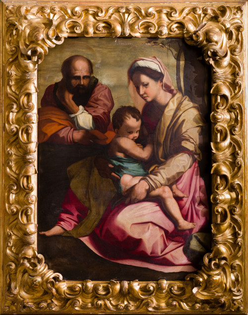 Esta pintura representando a la Sagrada Familia sigue puntualmente, tanto en sus modelos como en sus proporciones y tamaño, la conocida obra de Andrea del Sarto, realizada alrededor del 1528, y conservada, actualmente, en la Galería Nacional de Arte Antiguo del Palazzo Barberini en Roma. La composición creada por Sarto logró alcanzar una enorme fama en su época, provocando de inmediato la elaboración de numerosas copias que repitieron el mismo modelo.