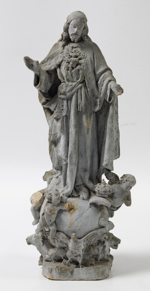 Sin presentar firma ni sello, se atribuye al escultor por sus características estilísticas y por pertenecer al mismo conjunto de obras. Responde plenamente a los modelos de José María Ponsoda pero no se ha podido relacionar con ninguna de sus esculturas. El artista configuró una imagen del Sagrado Corazón de Jesús que tuvo un gran éxito en su época y realizó encargos con esta misma temática para diferentes parroquias.