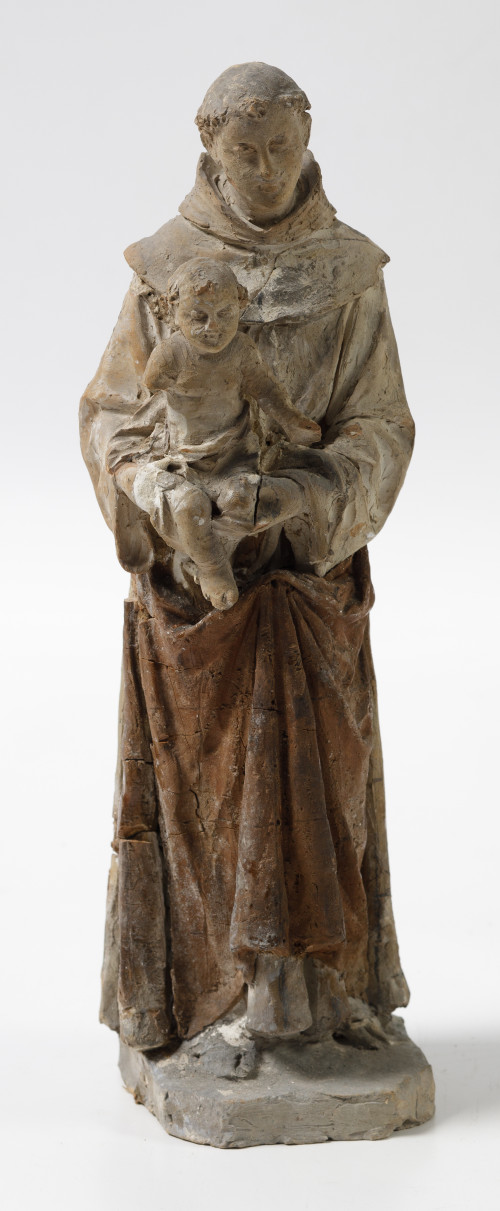 Sin sellos ni firmas este boceto para escultura se atribuye a Ponsoda por razones de estilo y por pertenecer a la misma colección de obras. El artista realizó un gran número de imágenes de San Antonio de Padua como las de la iglesia de San Lorenzo de Valencia, los Capuchinos de Santander, las parroquias de Alcázar de San Juan, Villanueva de Castellón, Tavernes de Valldigna, etc. Su sencillez permite suponer que pudo ser el modelo de una obra destinada a la devoción privada.