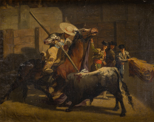 Firmado y fechado en el ángulo inferior izquierdo. Al dorso etiqueta de la exposción "Toros y toreros"