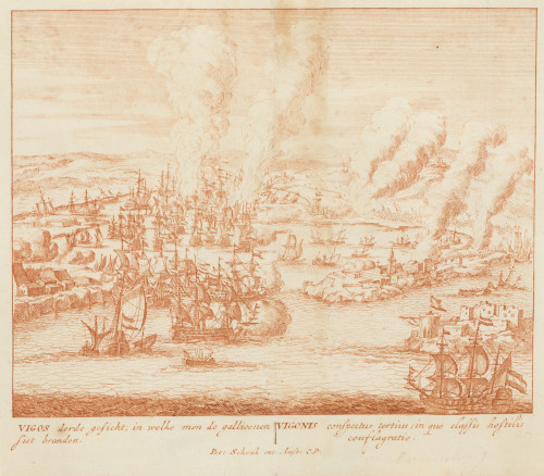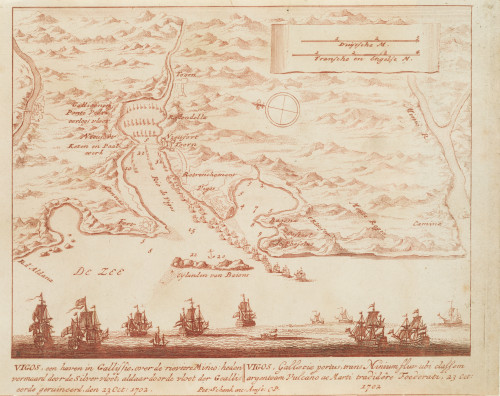 1ª.- Vista y carta náutica de la Ría de Vigo con la Flota de la Plata.