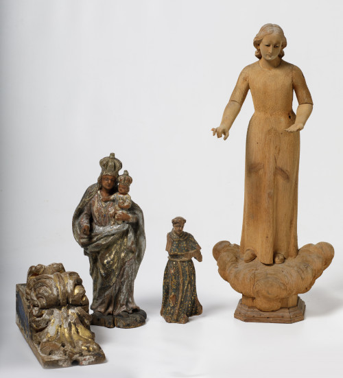 Tallada en madera de pino y con ojos de pasta vítrea. Brazos articulados. Faltas.