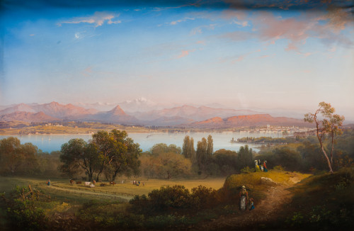 "Vista de la ciudad de Ginebra con el lago Leman, el Mont Blanc al fondo y personajes y ganado en primer plano"