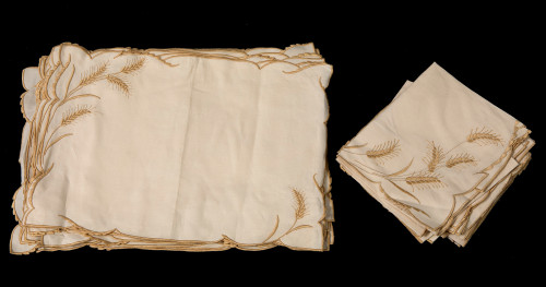 Juego de 17 individuales y 18 serviletas, en hilo crema con motivos de espigas bordadas.