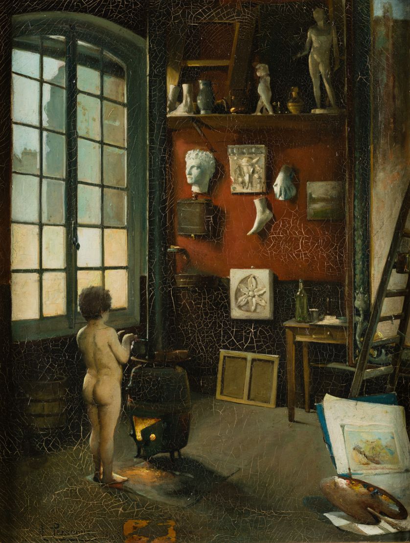 "Niño desnudo calentandose en el estudio de un artista"