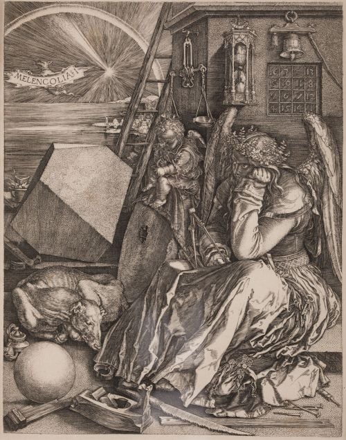Representa el temperamento melancólico, enigmático y creativo. Figura rodeada de instrumentos propios de actividades científicas y artísticas. Cuadrado mágico con números, cuyas múltiples posibles combinaciones de 4, suman 34. Único titulado en la composición y una de sus tres obras maestras con los de S. Jerónimo y El Caballero. 1514. Tirada posterior.