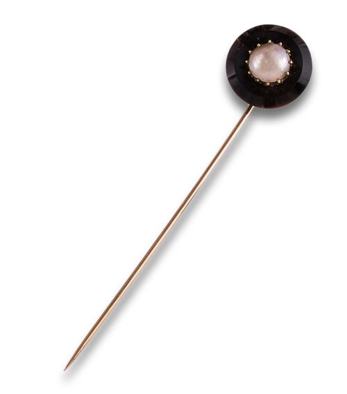 Alfiler antiguo de oro amarillo de 14 kt. Centro de perla barroca y placa de ónix.