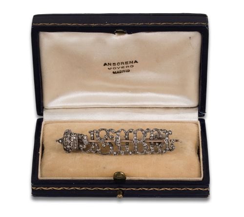 Alfiler de la segunda mitad del siglo XIX atribuido a ANSORENA realizado en oro y plata con diamantes talla rosa. Presenta en uno de sus extremos corona real y a lo largo del diseño el nombre de YSABEL entrelazado.