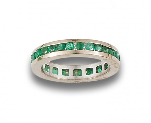 Alianza sin fin de oro blanco de 18 kt. formada por esmeraldas, talla brillante engastadas en carril.