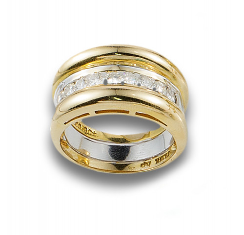 Ancha sortija media alianza de oro amarillo y blanco de 18 kt. Formada por una hilera central de diamantes, talla brillante, peso total estimado de 0.90 ct. engastados en carril. Montura gallonada. Peso: 10,4 Gr..