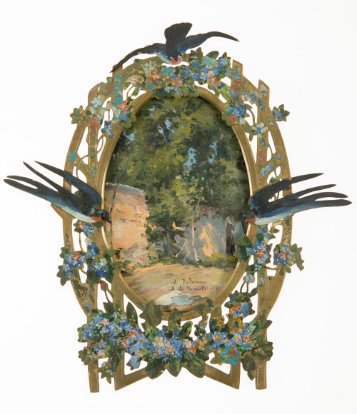 Firmado y dedicado, "A Paloma", en la parte inferior. Con su marco de estilo modernista realizado en latón policromado con decoración de golondrinas y flores.