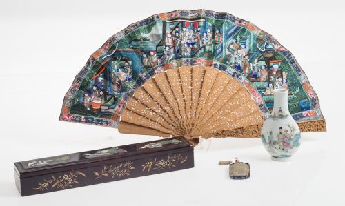 Abanico chino de Cantón, ppios S.XX. Varillaje de sándalo tallado y país de papel iluminado al gouache con escenas de personajes, con aplicaciones de seda y hueso, en anverso y reverso. Estuche de madera lacada en negro con la misma decoración. Medidas: 28,5 cm.