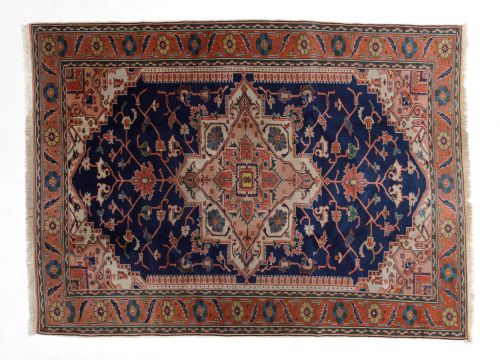De campo azul y cenefa rosa con decoración de motivos vegetales estilizados.