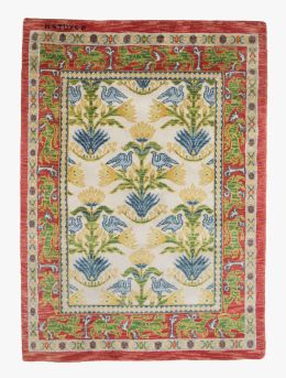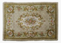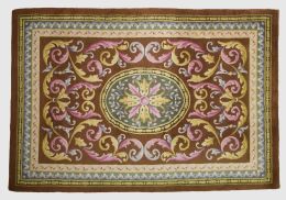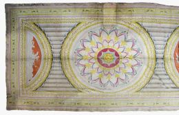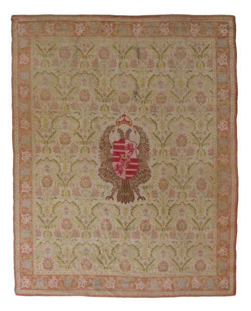 Diseño Cuenca con motivos florales y blasón en el centro. Campo beige y cenefa salmón. Presenta desgastes y áreas desteñidas.