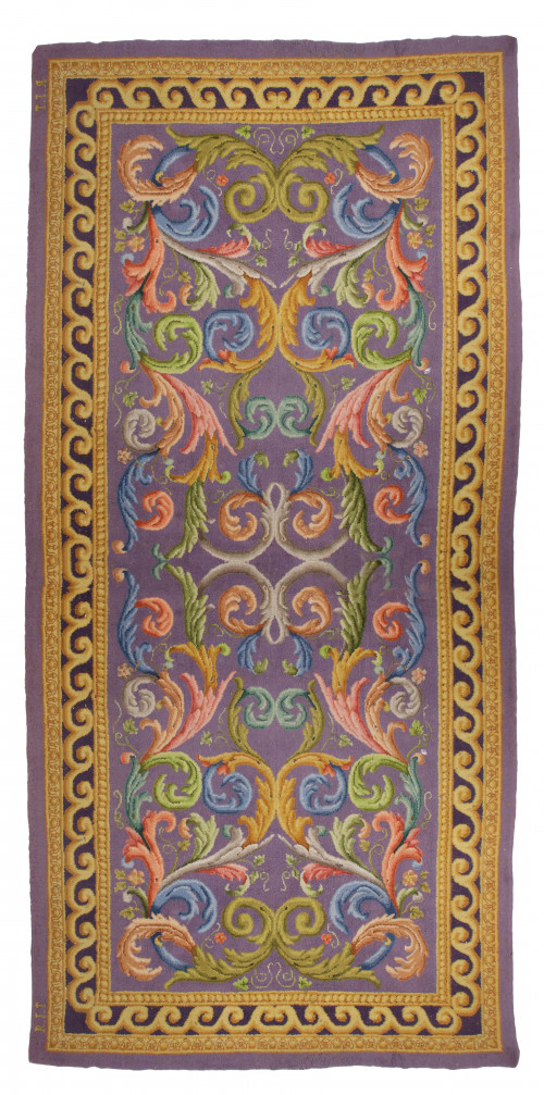 Alfombra de lana anudada a mano, Real Fábrica de Tapices, 1940. De campo color berenjena con decoración de roleos y cenefa en tonos dorados. Firmada y fechada.