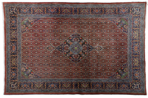 De campo granate y cenefa azul con medallón central y decoración de motivos geométricos.