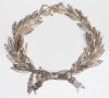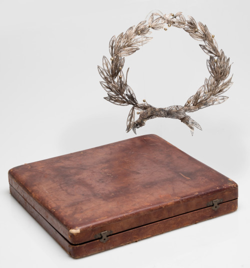 Antigua corona realizada en filigrana de plata y plata vermeil. Probablemente se trata de una de las 923 coronas de laurel, regaladas a José Zorrilla, con motivo de su coronación como Poeta Nacional en Granada, año 1889 (Distintos ejemplares se encuentran actualmente en la RAE, casa Zorrilla de Valladolid, Liceo de Granada...)