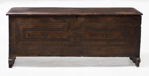 Antiguo arcón, norte de España S.XVIII y posterior. Frente tallado con motivos geométricos. Tapa repuesta. Faltas e importantes marcas de xilófagos. Medidas: 71 x 172 x 57 cm.