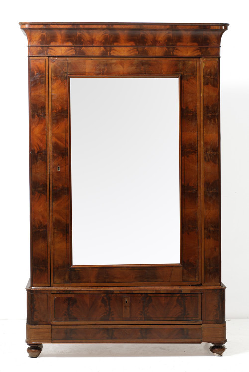 Armario S. XIX-XX, en palma de caoba, puerta centrañ con espejo, dos cajones en la falda. Interior con tres cajones, ds de ellos de menor tamaño en el mismo registro.