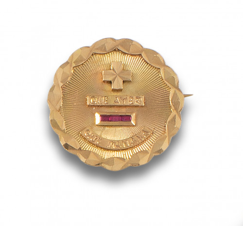 Broche circular en oro amarillo de 18 kt. con motivo central de cruz griega y rubíes franja de rubíes calibrados. Incrito "Que ayer, que mañana".Peso: 6 Gramo.
