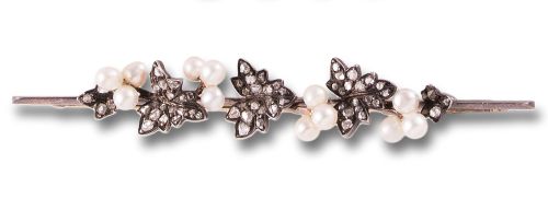 Alfiler de la segunda mitad del siglo XIX atribuido a ANSORENA realizado en oro y plata con diseño de hojas de vid cuajadas de diamantes talla rosa y perlitas.