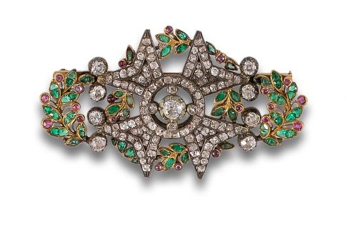 BROCHE EN ORO Y PLATA CON DIAMANTES, ESMERALDAS Y RUBÍES