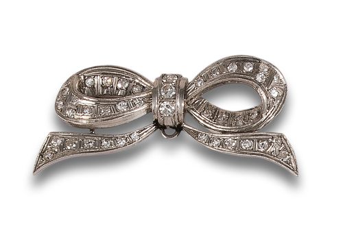 Broche lazo, años 30, en platino. Diseño de lazadas de diamantes, talla 8/8, engastados en grano.